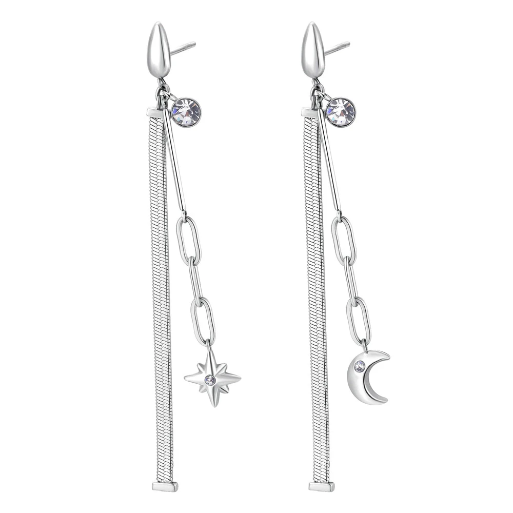 Visací náušnice řady Chant z chirurgické oceli 316l s leštěným povrchem zdobené krystaly. Náušnicové zapínání je na puzetky. Elegantní zářivé náušnice dlouhé 70 mm.