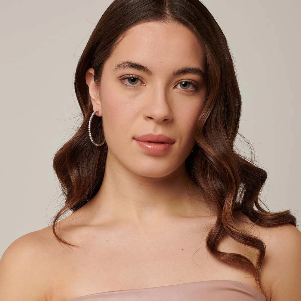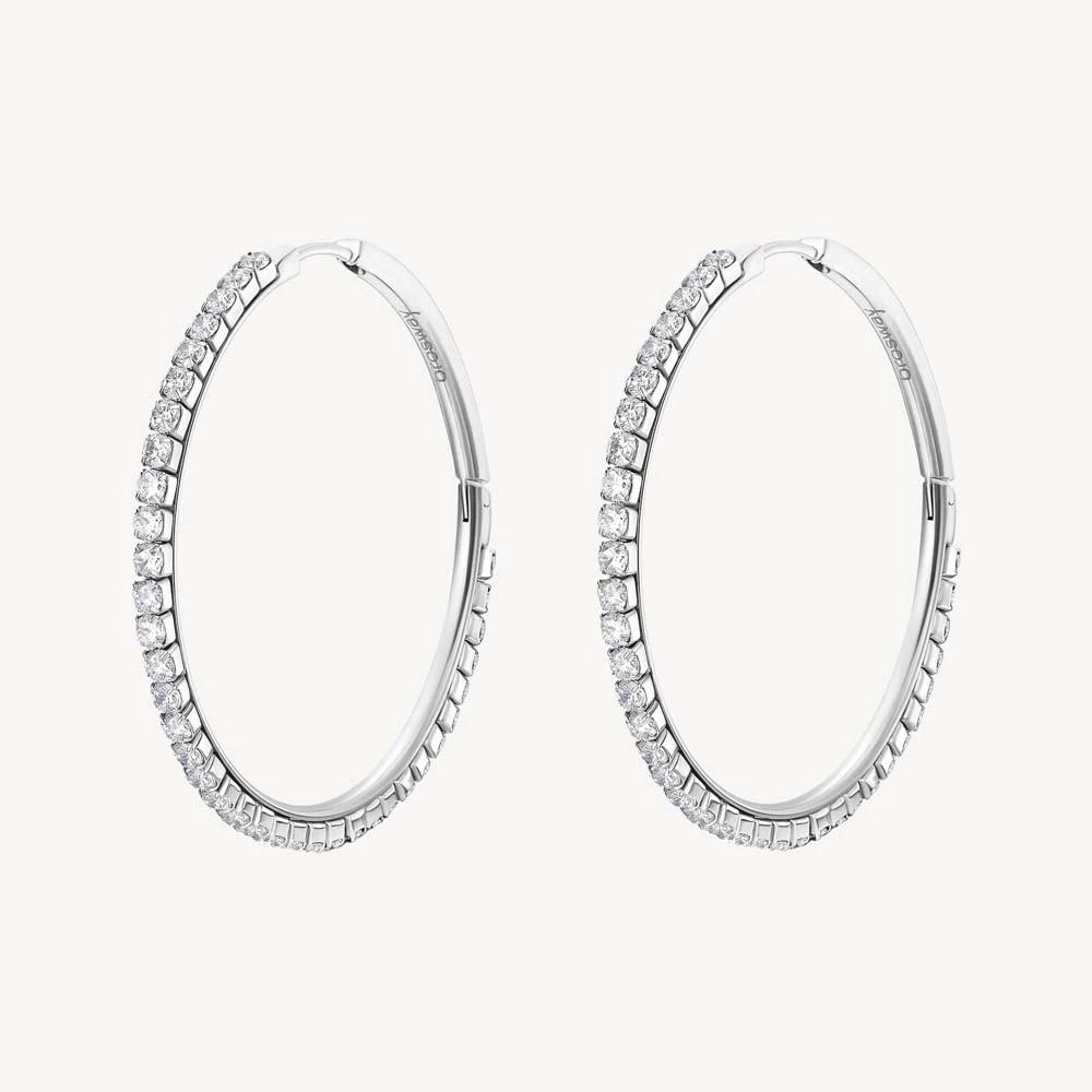 Náušnice kruhy z chirurgické oceli. Povrch náušnic je leštěný. Náušnice jsou osazené prvotřídními zirkony. Průměr náušnic 46mm, náušnicové zapínání je kloubové.