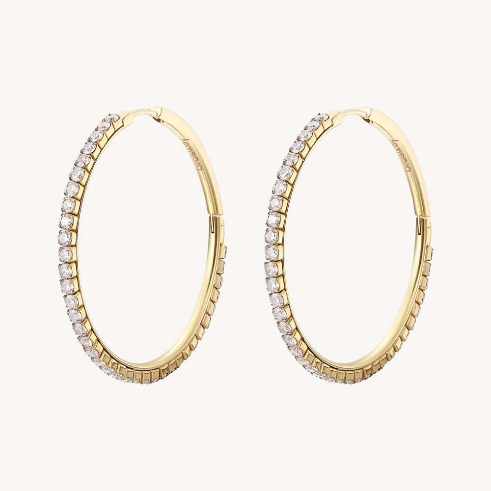 Náušnice kruhy z chirurgické oceli. Povrch náušnic je pozlacený technologií PVD. Náušnice jsou osazené prvotřídními zirkony. Průměr náušnic 46mm, náušnicové zapínání je kloubové.
