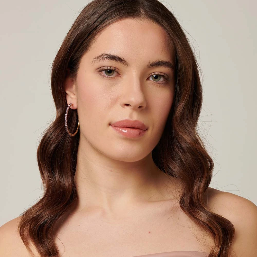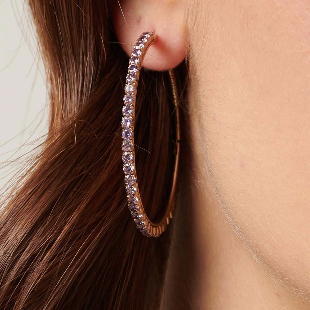 Náušnice kruhy z chirurgické oceli. Povrch náušnic je pozlacený technologií PVD. Náušnice jsou osazené prvotřídními zirkony. Průměr náušnic 46mm, náušnicové zapínání je kloubové.
