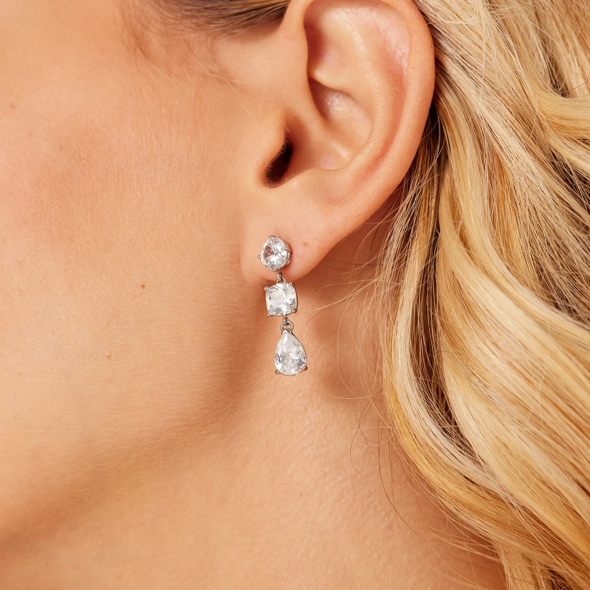 Visací náušnice vyrobené z kvalitní chirurgické oceli ozdobené prvotřídními zirkony. Povrch ocelový částí je leštěný, zirkony jsou v bílé barvě. Náušnicové zapínání je na puzetky. Elegantní visací náušnice dlouhé 25 mm.