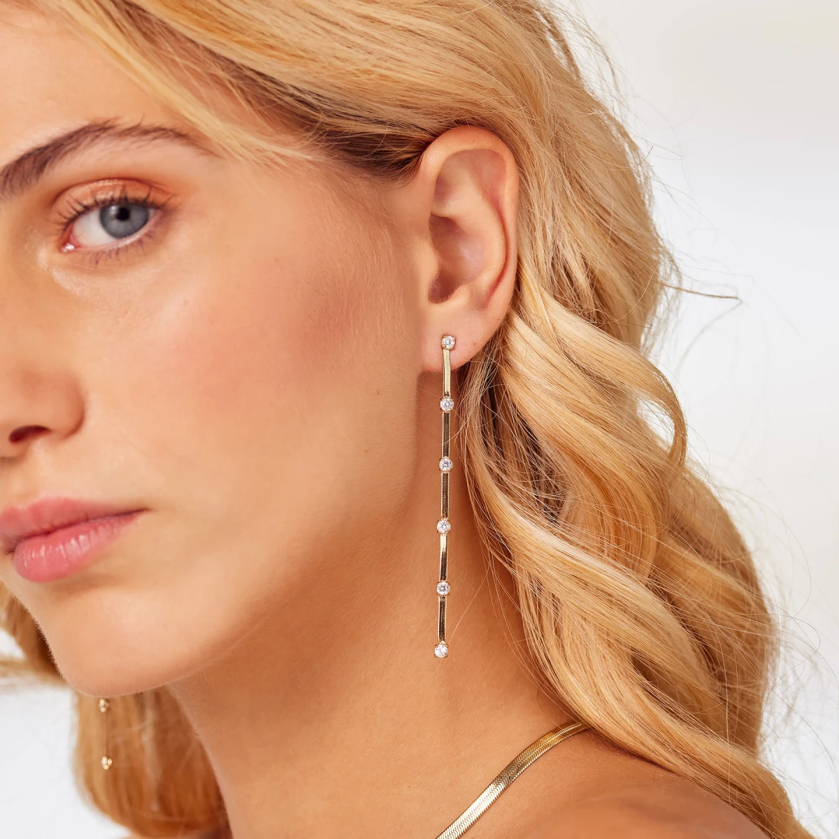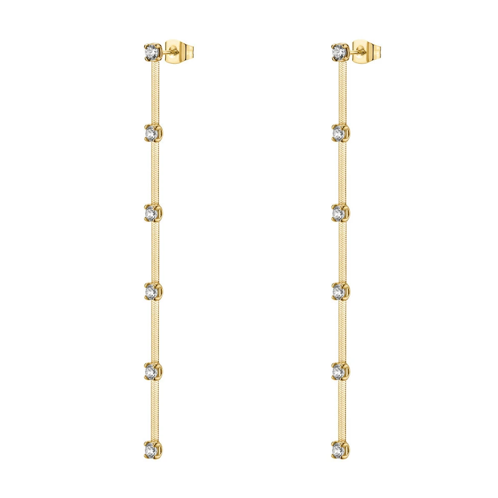 Dlouhé náušnice z chirurgické oceli se zirkony. Povrch náušnic je pozlacený technologií PVD. Náušnicové zapínání je na puzetky. Délka náušnic 80 mm.,