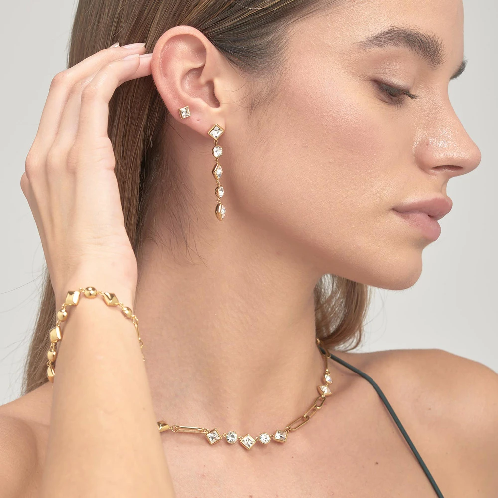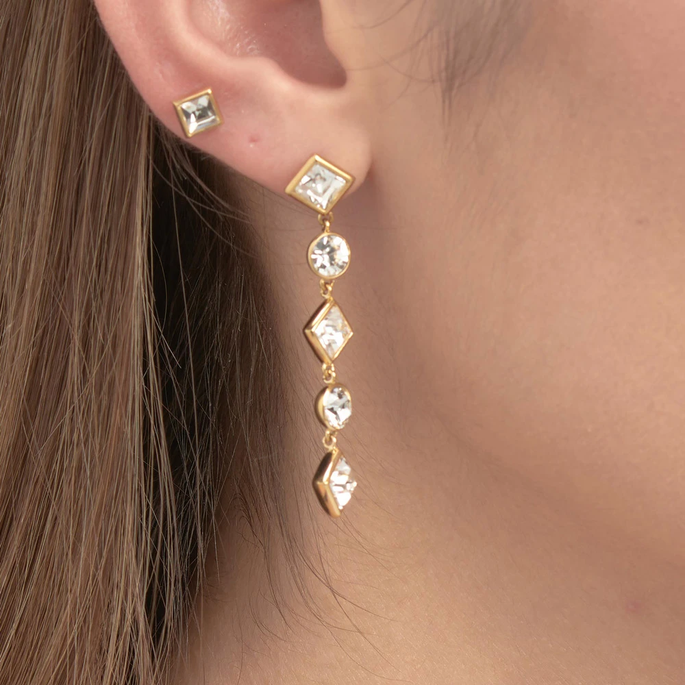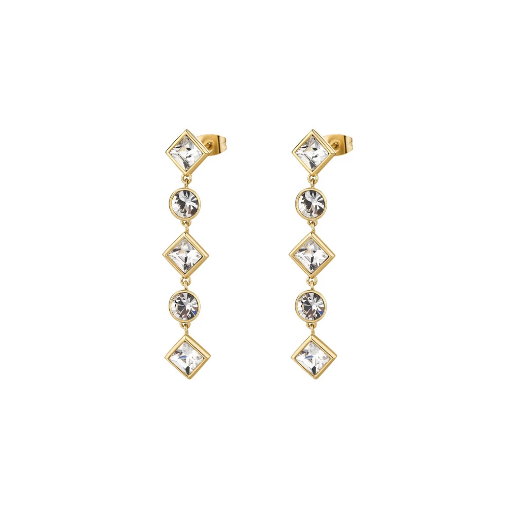 Visací náušnice z chirurgické oceli 316l zdobené zářivými kamínky. Náušnice mají leštěný povrch pozlacený technologií PVD. Náušnicové zapínání je na puzetky. Elegantní náušnice dlouhé 55mm.
