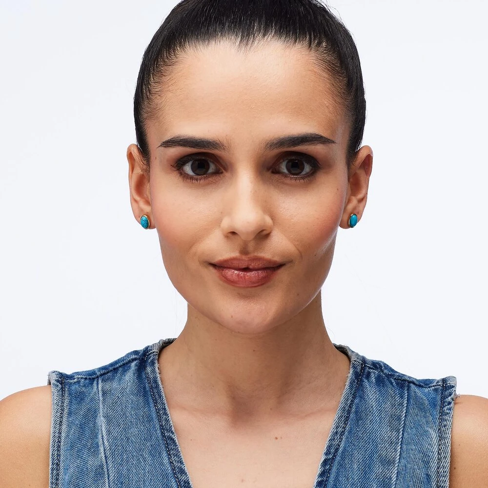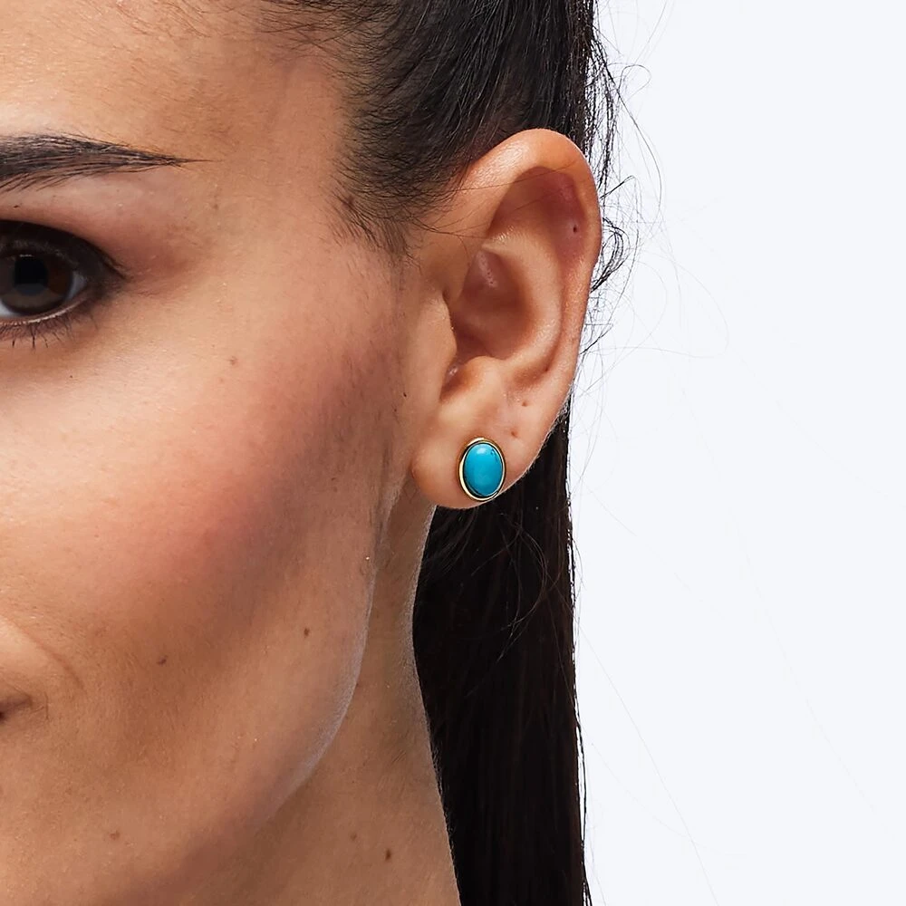 Náušnice pecky z chirurgické oceli s pozlaceným povrchem. Náušnice jsou ozdobené rekonstituovaným tyrkysem. Náušnicové zapínání je na puzetky. Elegantní dámské náušnice s tyrkysem, který je považován za kámen ochrany, klidu a ženské síly.