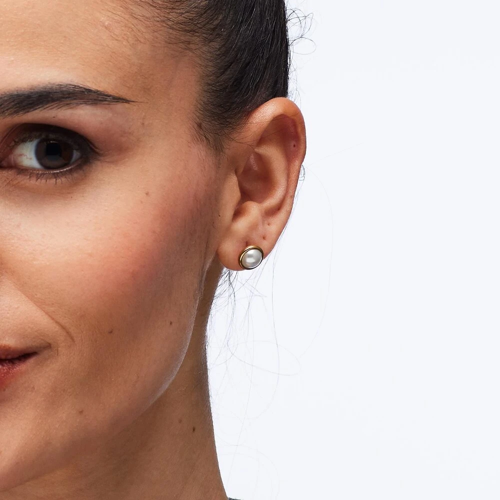 Náušnice z chirurgické oceli. Povrch náušnic je pozlacený žlutým zlatem technologií PVD. Náušnice jsou osazené umělou perlou. Průměr náušnic 9 mm. Náušnicové zapínání je na puzetky.