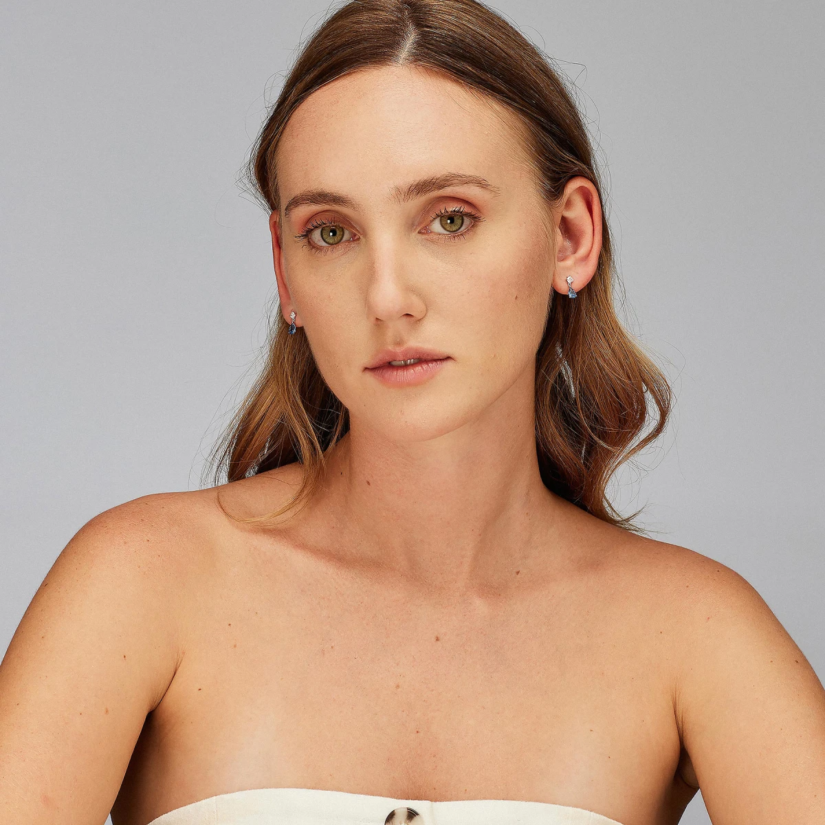Náušnice visací vyrobené ze stříbra 925/1000. Náušnice jsou osazené prvotřídními zirkony. Povrch stříbra je porhodiovaný. Nanesené rhodium zamezuje přirozené oxidaci stříbra, potlačuje alergické reakce a zajišťuje tak náušnicím dlouhodobý bezchybný vzhled a jejich bezproblémové nošení. Náušnice jsou dlouhé 12mm. Náušnicové zapínání je na puzetky.