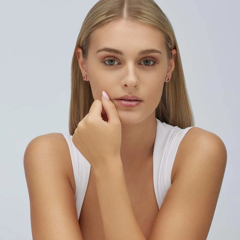 Stříbrné náušnice s kamínky. Náušnice jsou vyrobené ze stříbra ryzosti 925/1000 a jsou osazené prvotřídními zirkony. Povrch náušnic je porodiovaný. Nanesené rodium dodává náušnicím jasnou barvu s leskem, současně chrání jejich povrch před poškrábáním a zaručuje náušnicím dlouhodobý bezvadný vzhled. Náušnicové zapínání je na puzetky.