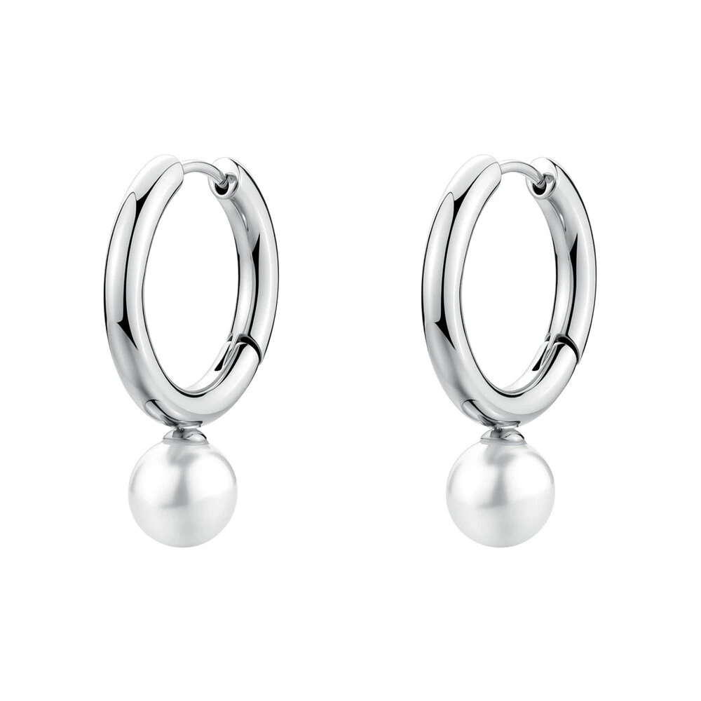 Kruhové náušnice vyrobené z kvalitní chirurgické oceli a ozdobené umělým perlami. Povrch náušnic je leštěný. Náušnicové zapínání je kloubové. Elegantní perlové náušnice "vysoké" 25mm.