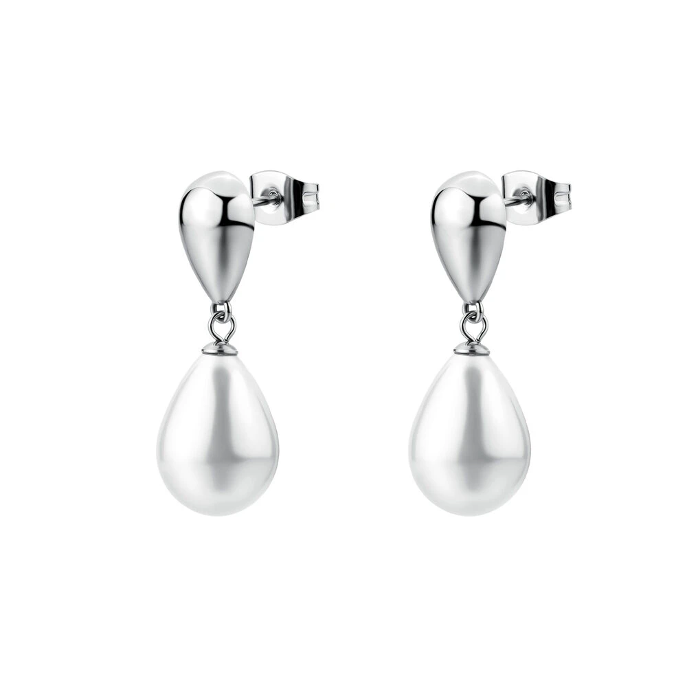 Visací náušnice vyrobené z kvalitní chirurgické oceli a ozdobené umělým perlami. Náušnice mají leštěný povrch. Náušnicové zapínání je na puzetky. Elegantní perlové náušnice dlouhé 30mm.