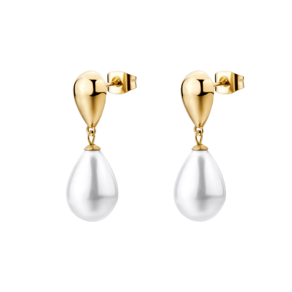 Visací náušnice vyrobené z kvalitní chirurgické oceli ozdobené umělými perlami. Povrch náušnic pozlacený technologií PVD. Náušnicové zapínání je na puzetky. Elegantní perlové náušnice dlouhé 30mm.
