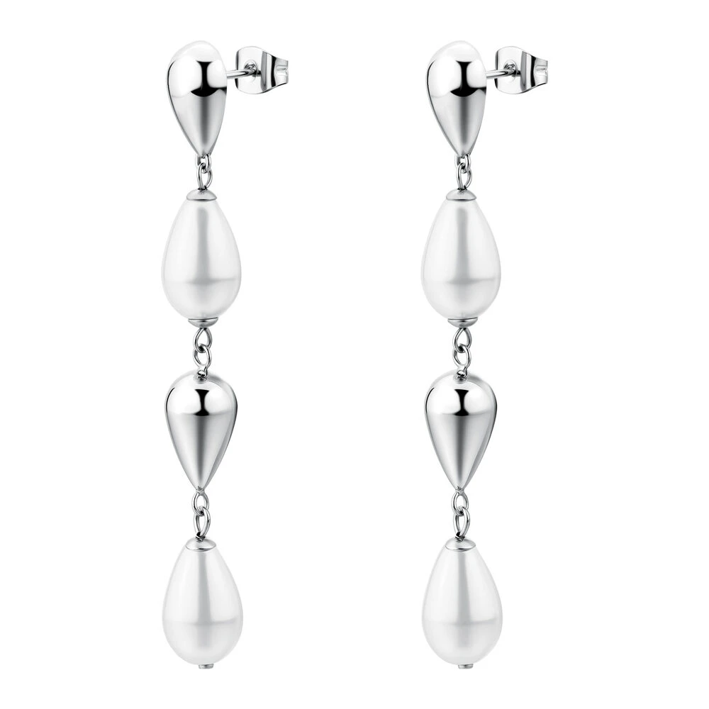 Visací náušnice vyrobené z kvalitní chirurgické oceli ozdobené umělými perlami. Povrch náušnic je leštěný. Náušnicové zapínání je na puzetky. Elegantní perlové náušnice dlouhé 58mm.