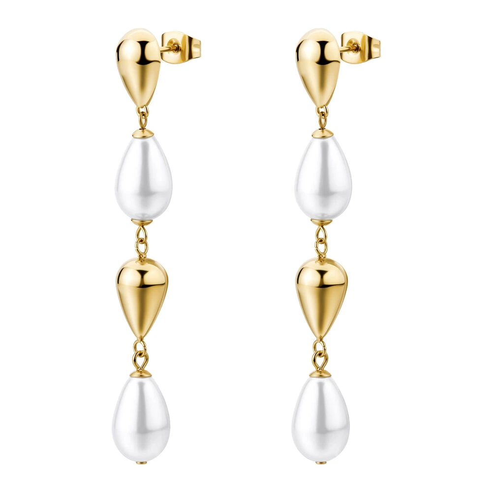 Visací náušnice vyrobené z kvalitní chirurgické oceli ozdobené umělými perlami. Povrch náušnic pozlacený technologií PVD. Náušnicové zapínání je na puzetky. Elegantní perlové náušnice dlouhé 58mm.