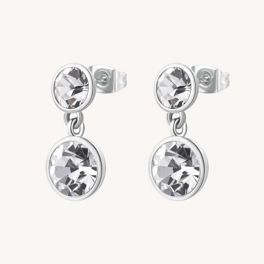Visací náušnice z chirurgické oceli zdobené zářivými krystaly. Povrch náušnic je leštěný. Náušnicové je zapínání je na puzetky.