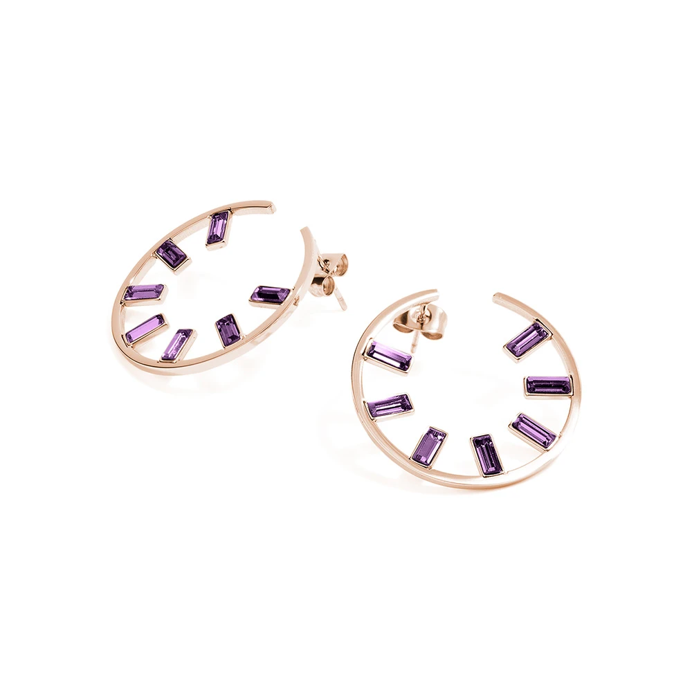 Výrazné náušnice kroužky z kolekce Brosway Symphonia s fialovými krystaly jsou a vyrobené z chirurgické oceli 316L a růžově pozlacené technologií PVD. Šperky vyrobené z chirurgické oceli jsou odolné proti poškrábání, nemění barvu, neoxidují, nevyvolávají alergické reakce ani nereagují na pot a prach. Průměr náušnic je 30 mm a zapínání je na puzetu.