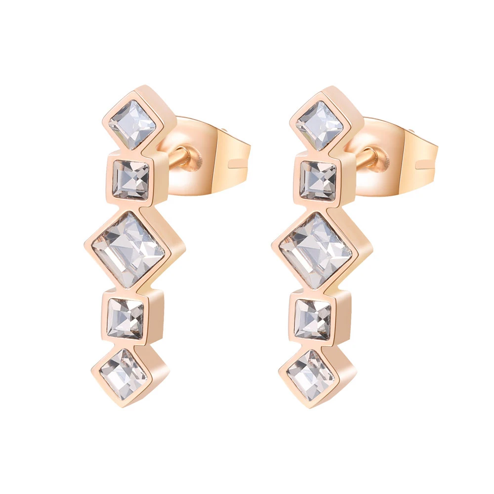 Náušnice z chirurgické oceli 316l zdobené zářivými krystaly z kolekce Symphonia. Náušnice mají růžový povrch upravený technologií PVD. Náušnicové zapínání je na puzetky. Dámské náušnice dlouhé 17mm.