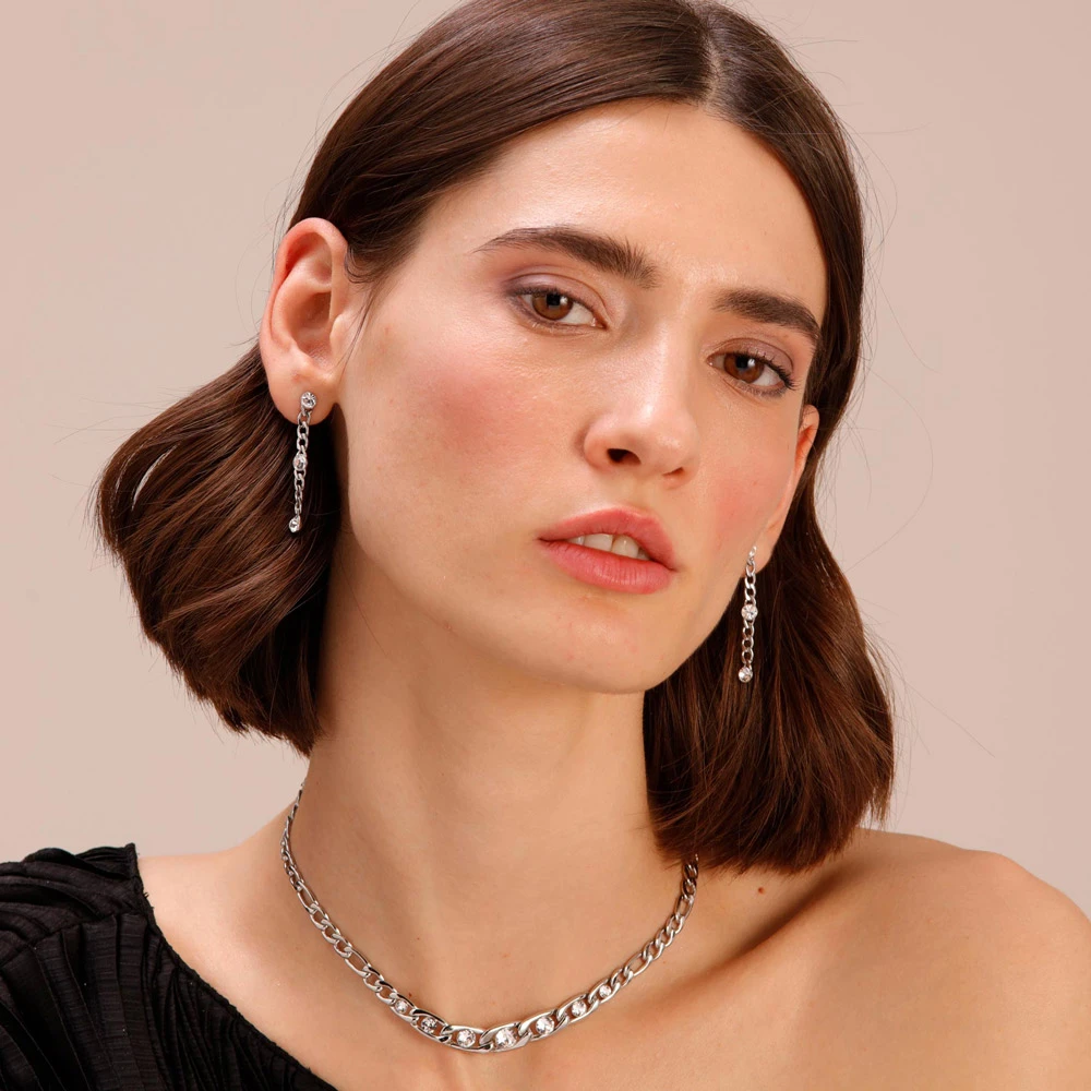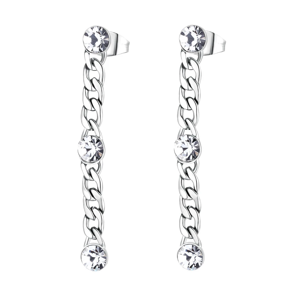 Visací náušnice řady Symphonia z chirurgické oceli 316l s leštěným povrchem zdobené čirými krystaly. Náušnicové zapínání je na puzetky. Elegantní dámské náušnice dlouhé 67mm.