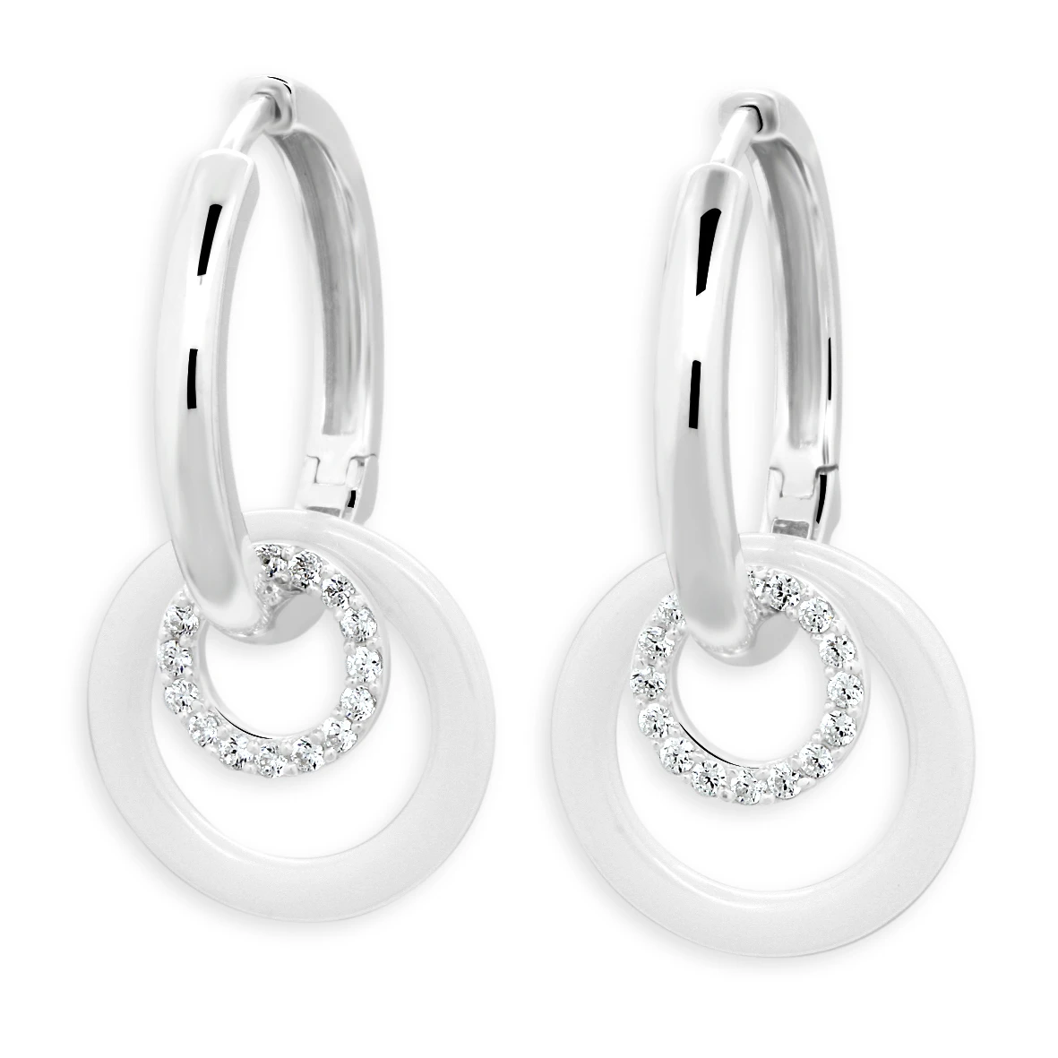 Visací náušnice kroužky z keramiky a stříbra 925/1000. Bílé keramické ozdoby mají hladký leštěný povrch, stříbrná ozdoba se zirkony a stříbrný kroužek mají porhodiovaný povrch. Nanesené rhodium dodává náušnicím jasnou barvu s leskem a současně zaručuje dlouhotrvající bezchybný vzhled šperku. Náušnice jsou dlouhé 30mm, šířka 22mm.