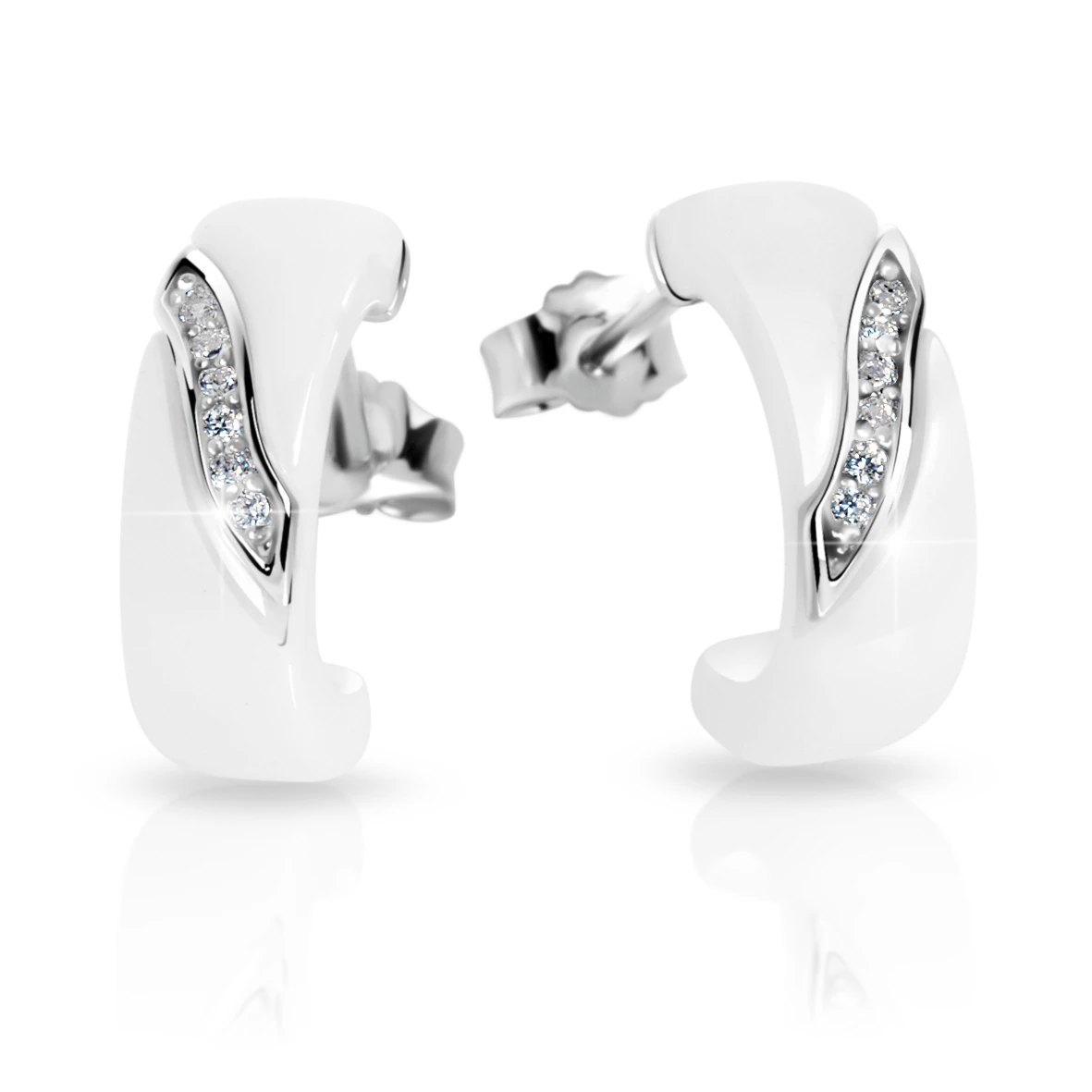 Náušnice Cerafi z keramiky a stříbra 925/1000. Do bílé keramiky je vložena stříbrná ozdoba osazená kubickými zirkony. Povrch stříbrné ozdoby je porhodiovaný. Nanesené rhodium dodává ozdobě jasnou barvu s leskem a současně zaručuje dlouhotrvající bezchybný vzhled šperku. Náušnice jsou dlouhé 13 mm, šířka 4 mm. Náušnicové zapínání je na puzety.