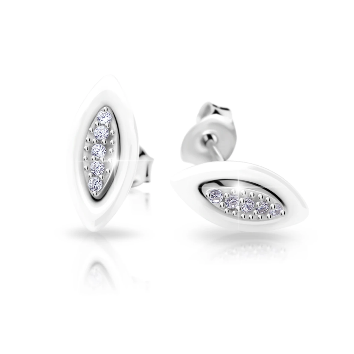 Náušnice Cerafi z keramiky a stříbra 925/1000. Do bílé keramiky je vložena stříbrná ozdoba osazená kubickými zirkony. Povrch stříbrné ozdoby je porhodiovaný. Nanesené rhodium dodává ozdobě jasnou barvu s leskem a současně zaručuje dlouhotrvající bezchybný vzhled šperku. Rozměry náušnic 14x6mm. Náušnicové zapínání je na puzety.