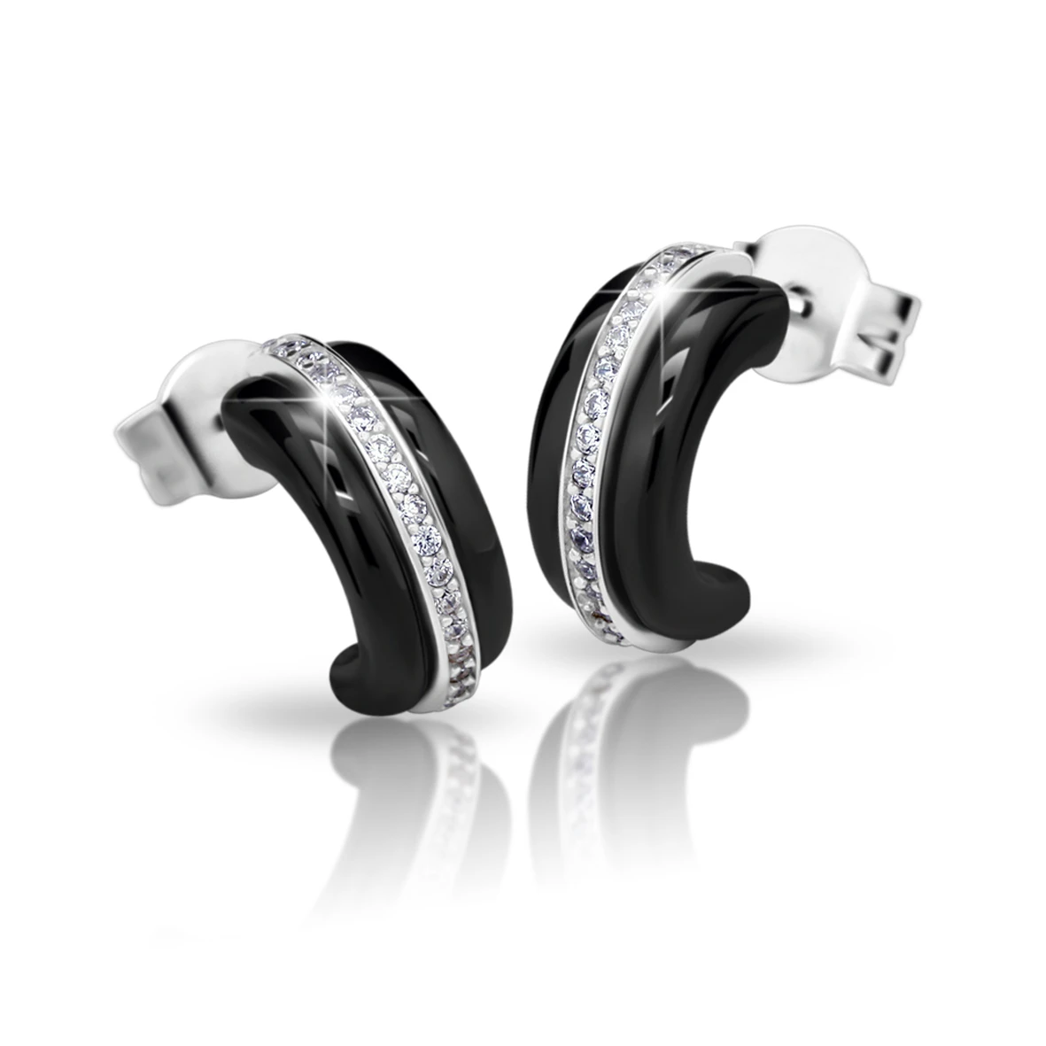 Náušnice Cerafi z keramiky a stříbra 925/1000. Do černé keramiky je vložena stříbrná ozdoba osazená kubickými zirkony. Povrch stříbrné ozdoby je porhodiovaný. Nanesené rhodium dodává ozdobě jasnou barvu s leskem a současně zaručuje dlouhotrvající bezchybný vzhled šperku. Rozměry: šířka 5mm, výška 12mm. Náušnicové zapínání je na puzety.