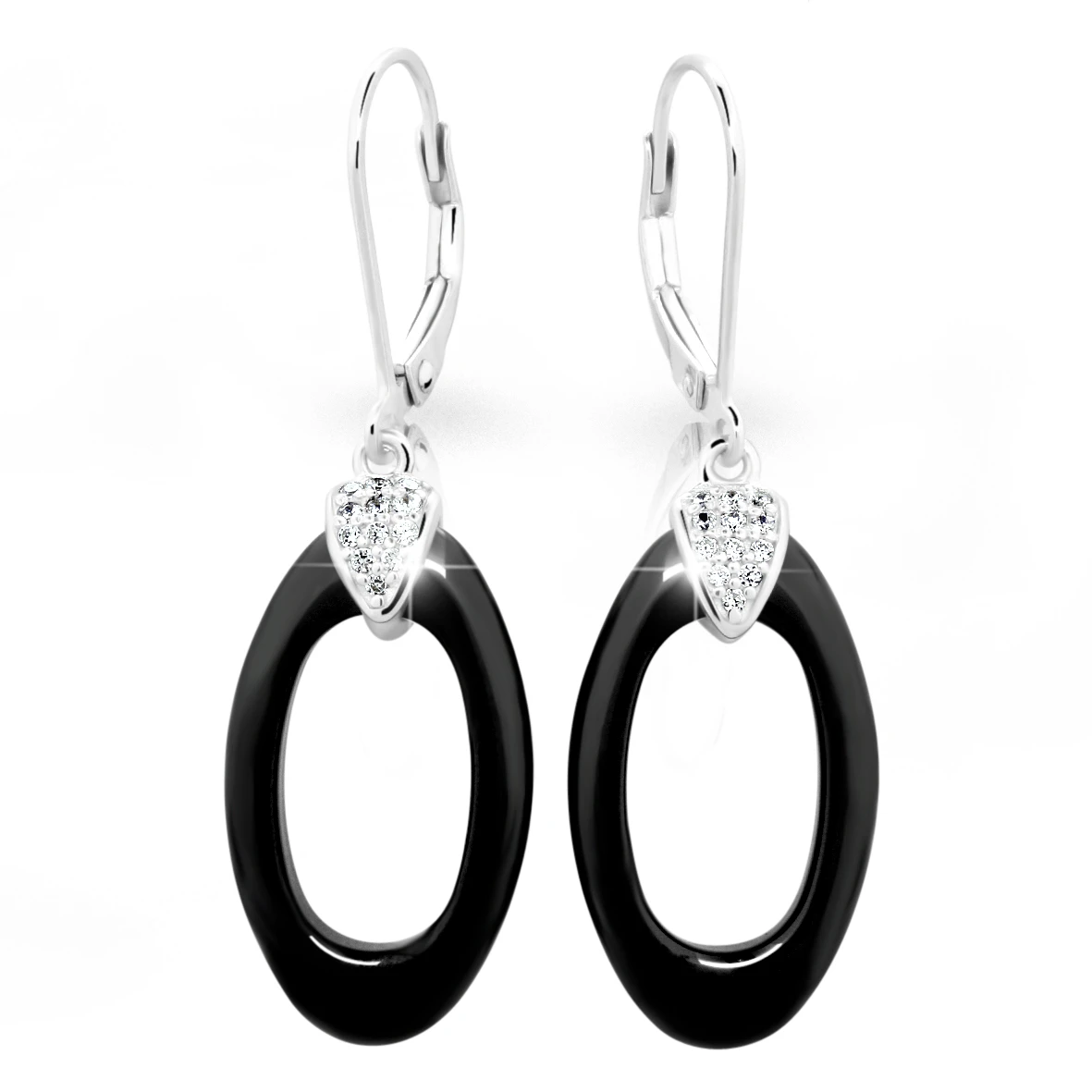 Visací náušnice Cerafi z keramiky a stříbra 925/1000. Černé keramické ozdoby mají hladký leštěný povrch, stříbrná ozdoba se zirkony a klapkové zapínání jsou porhodiované. Nanesené rhodium dodává náušnicím jasnou barvu s leskem a současně zaručuje dlouhotrvající bezchybný vzhled šperku. Náušnice jsou dlouhé 40mm, šířka 13mm.