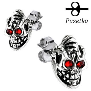 Náušnice pro muže chirurgická ocel 316l. Náušnice pecky s hlavou pankáče, který má rudě červené oči. Zapínání je na puzetky.Ocelové šperky jsou oblíbené nejen u mladších generací a lze říci, že se těší oblibě u všech věkových skupin. Šperky z chirurgické oceli jsou odolné proti poškození, neoxidují, jsou barevně stálé a nevyvolávají alergické reakce.