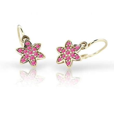 Dětské náušničky ze žlutého zlata ryzosti 585/000. Náušničky pro děti se zapínáním na brizuru, která zamezuje snadnému otevření zapínání a následné ztrátě náušniček. Ozdoba se zirkony má průměr 8,0mm, celková výška náušniček 15,4mm.