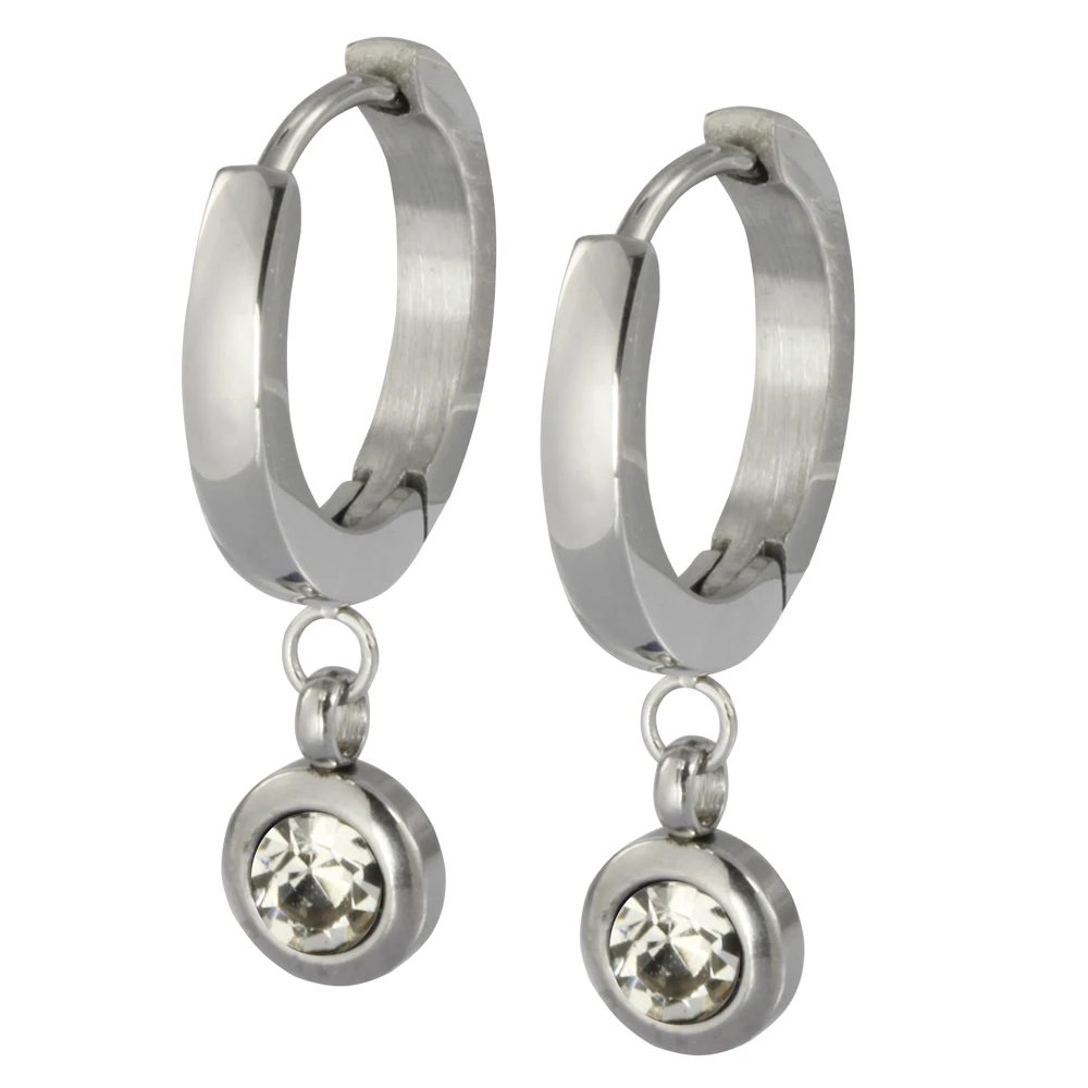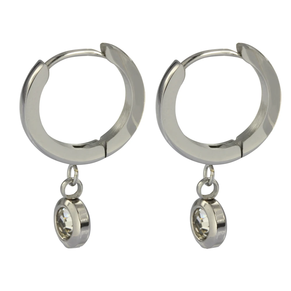 Náušnice z chirurgické oceli ozdobené kulatým přívěskem se zirkonem. Větší náušnice kroužky široké 2mm s vnějším průměrem 16mm. Přívěsek se zirkonem má průměr 6mm. Celková velikost náušnic 25mm. Náušnicové zapínání je kloubové.