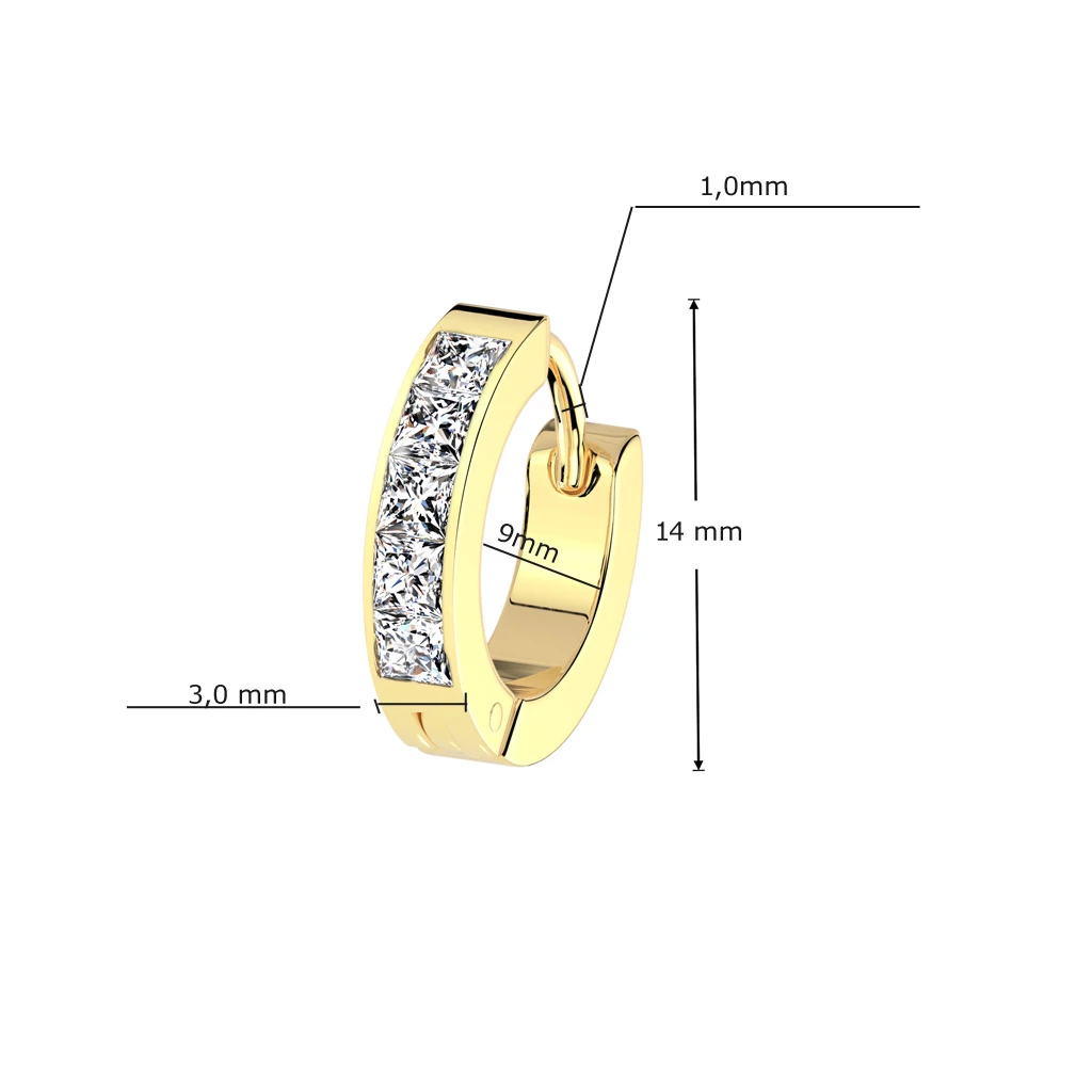 Náušnice z chirurgické oceli kroužky. Náušnice jsou ozdobené prvotřídními zirkony. Povrch náušnic je leštěný. Vnější průměr kroužků 14mm, vnitřní průměr 9mm, šířka náušnic 3mm. Náušnicové zapínání je kloubové. Uvedené rozměry náušnic najdete zobrazené na podpůrné fotografii. Cena je uvedena za pár ocelových náušnic se zirkony.