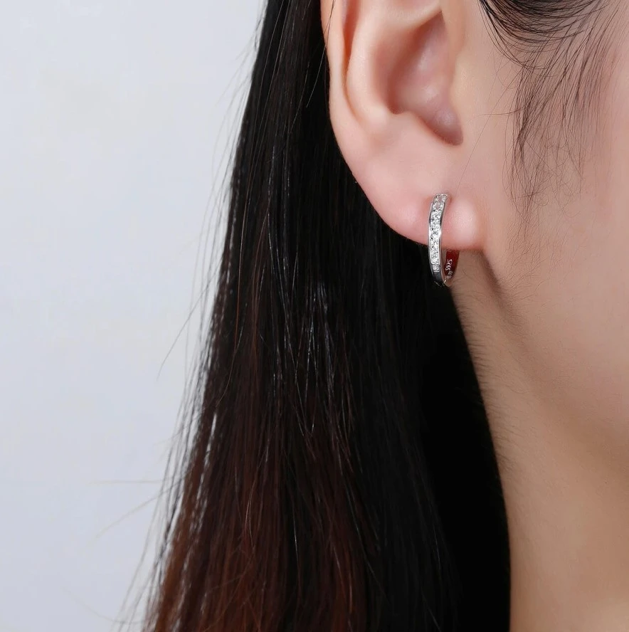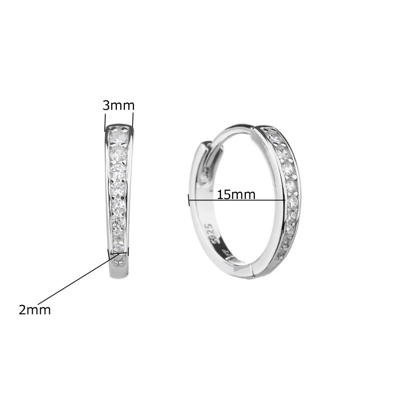 Náušnice kroužky vyrobené z kvalitního stříbra 925/1000. Náušnice jsou osazené prvotřídními zirkony. Povrch náušnic je porhodiovaný, což jim dodává jasnou barvu s leskem, potlačuje přirozenou oxidaci stříbra, zvyšuje odolnost povrchu proti poškrábání a zaručuje dlouhodobý bezvadný vzhled náušnic. Náušnice jsou široké2-3mm, vnější průměr náušnic 15 mm. Náušnicové zapínání je kloubové.