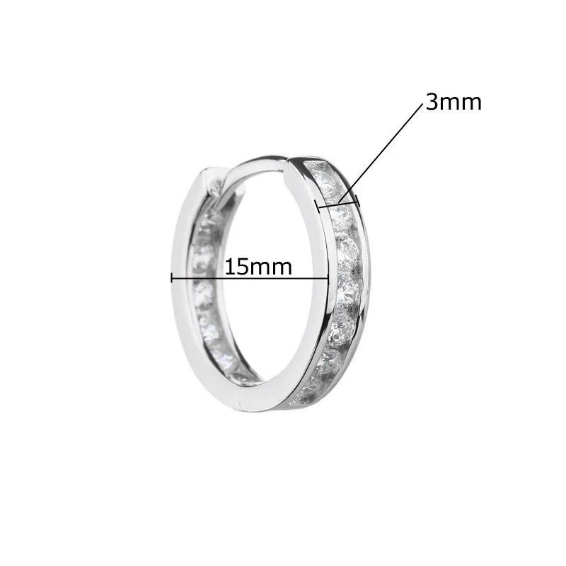 Náušnice kroužky vyrobené z kvalitního stříbra 925/1000. Náušnice jsou osazené prvotřídními zirkony. Povrch náušnic je porhodiovaný, což jim dodává jasnou barvu s leskem, potlačuje přirozenou oxidaci stříbra, zvyšuje odolnost povrchu proti poškrábání a zaručuje dlouhodobý bezvadný vzhled náušnic. Náušnice jsou široké 3mm, vnější průměr náušnic 15 mm. Náušnicové zapínání je kloubové.