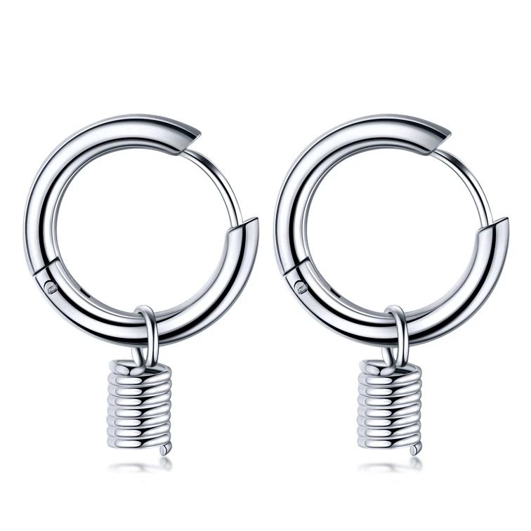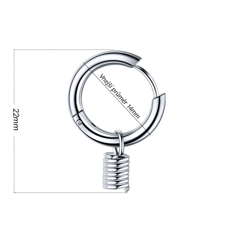 Náušnice z chirurgické oceli kroužky s přívěskem napodobujícím pružinu. Vnější průměr náušnic 14mm. Rozměry náušnic najdete zobrazené na podpůrné fotografii.