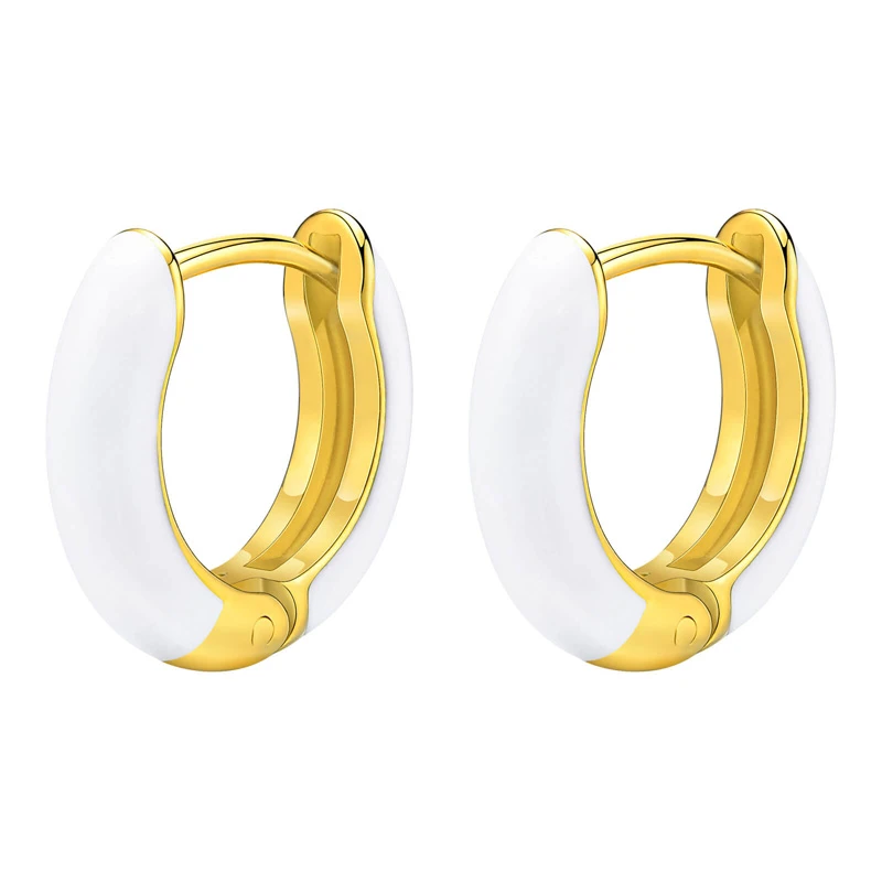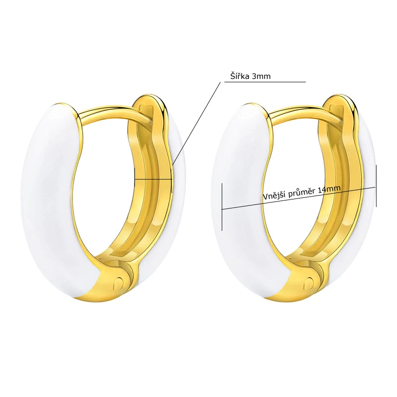 Ocelové náušnice kroužky. Povrch náušnic je pozlacený technologií PVD. Bílé části jsou smaltované. Vnější průměr náušnic 14mm, šířka náušnic 3mm. Zapínání náušnic je kloubové.