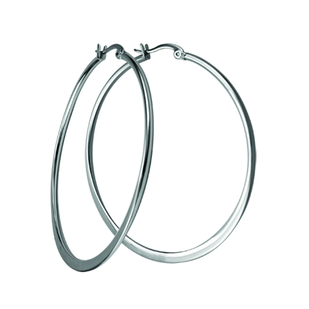 Kruhové náušnice z chirurgické oceli. Povrch náušnic je leštěný. Náušnice mají vnější průměr 55mm. Náušnicové zapínání je na francouzský zámek.