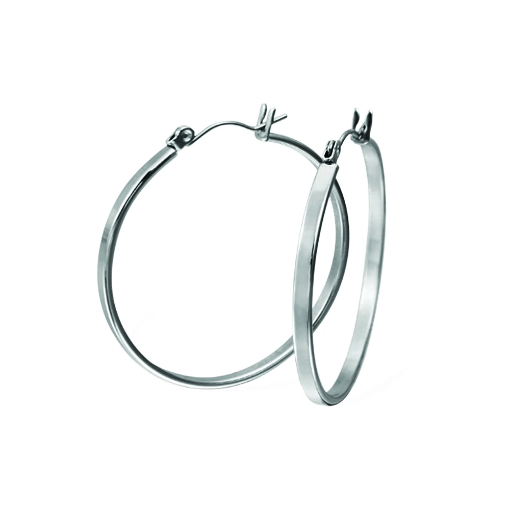 Kruhové náušnice z chirurgické oceli. Povrch náušnic je leštěný. Náušnice mají vnější průměr 35mm. Šířka náušnic 2,5mm. Náušnicové zapínání je na francouzský zámek.