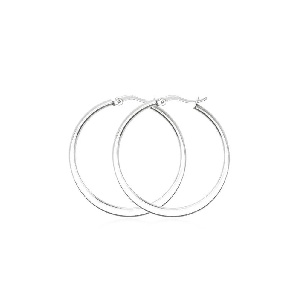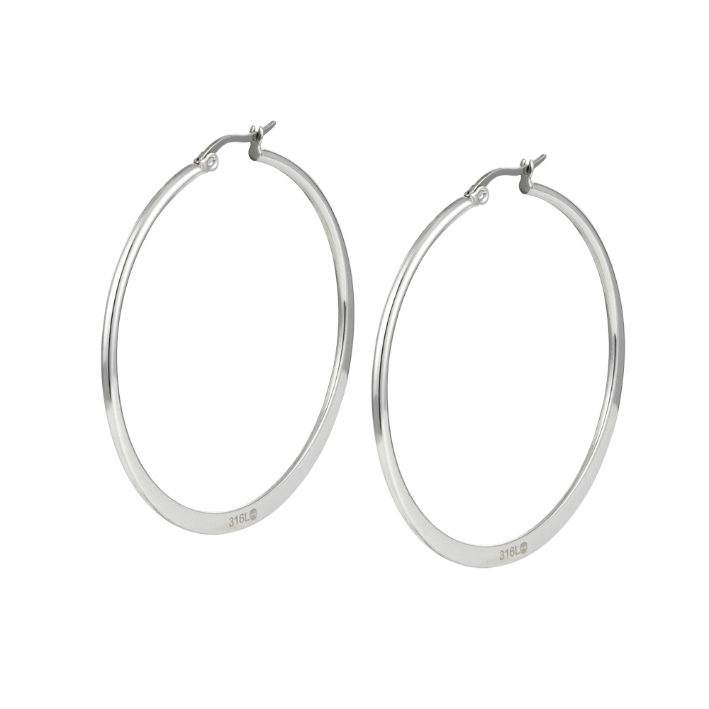 Kruhové náušnice z chirurgické oceli. Povrch náušnic je leštěný. Náušnice mají vnější průměr 32mm. Náušnicové zapínání je na francouzský zámek. Uvedená cena platí za pár.