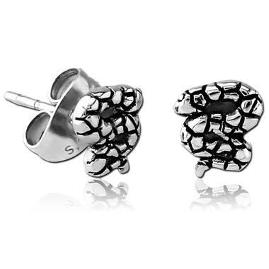 Naušnice do uší pecky - had. Povrch náušnic je leštěný s černým plastickým vzorem hadí kůže. Rozměr náušnic 6x6 mm. Náušnice se zapínají pomocí puzetek.