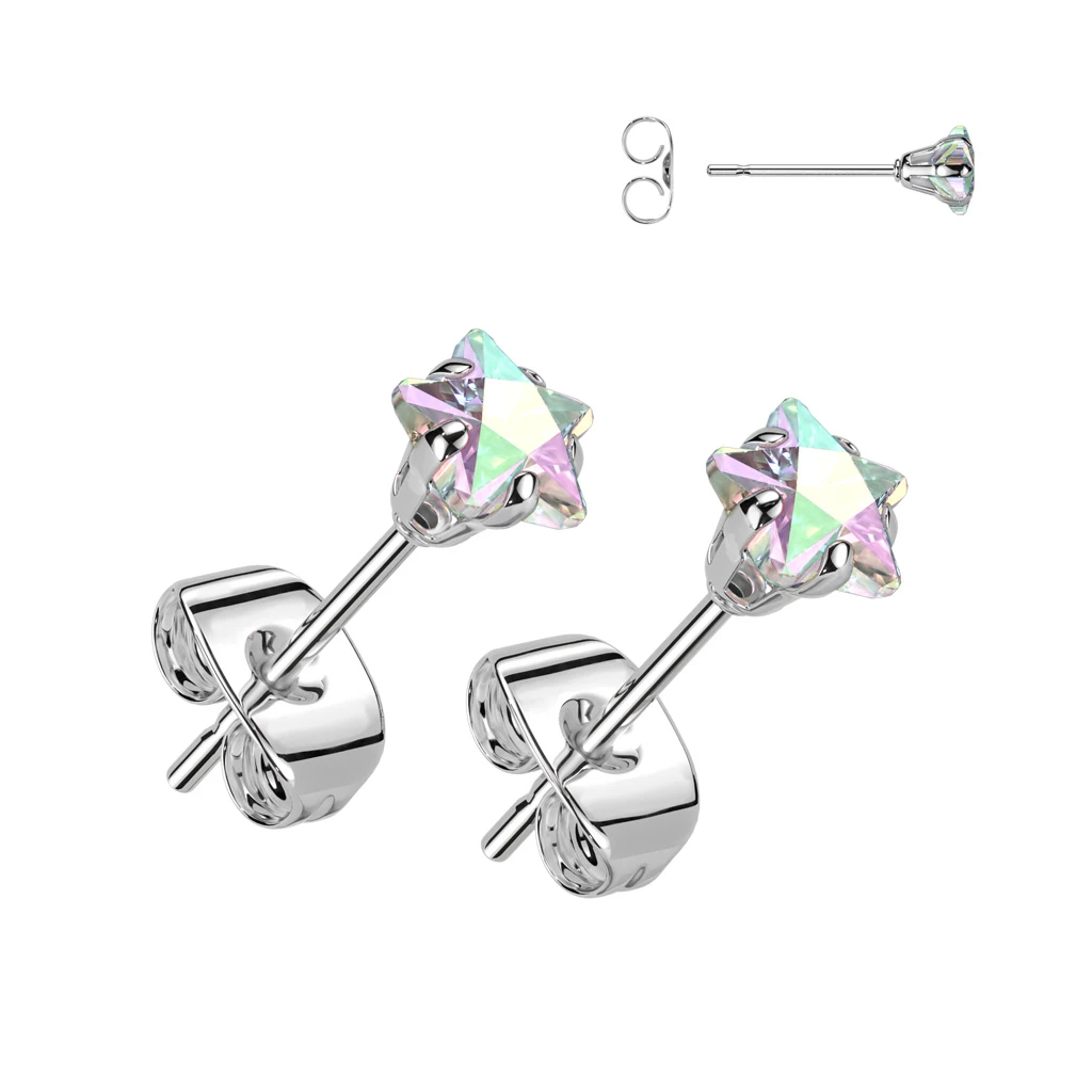 Ocelové náušnice pecky s duhovými zirkony ve tvaru hvězd. Náušnicové zapínání je na puzetky.