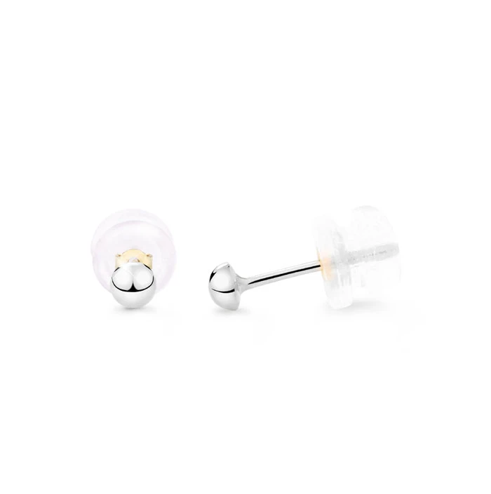 Náušnice pecky z bílého zlata 585/000. Povrch náušnic je leštěný. Průměr polokuličky 3mm. Naušnice se zapínají pomocí puzetek ze žlutého zlata uložených v silikonu.