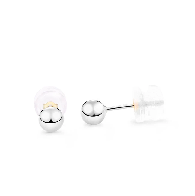 Náušnice pecky z bílého zlata 585/000. Povrch náušnic je leštěný. Průměr kuličky 4mm. Naušnice se zapínají pomocí puzetek ze žlutého zlata uložených v silikonu.