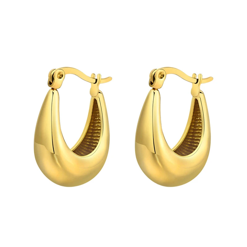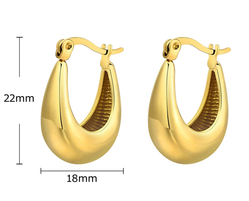Oválné náušnice z chirurgické oceli s povrchem pozlaceným technologií PVD. Náušnice mají rozměr 22x18mm. Šířka náušnic v nejširším bodě 7mm. Náušnicové zapínání je na francouzský zámek.