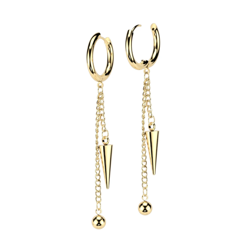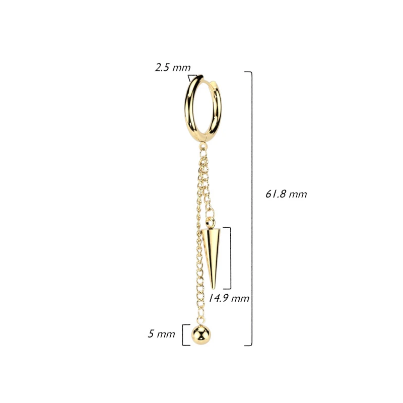 Dlouhé náušnice z chirurgické oceli. Náušnice jsou tvořené kruhy s vnějším průměrem 16 mm, a dvěma přívěsky na řetízku. Celková délka náušnic 61,8 mm. Celkové rozměry náušnic najdete zobrazené na podpůrné fotografii. Povrch náušnic je leštěný.