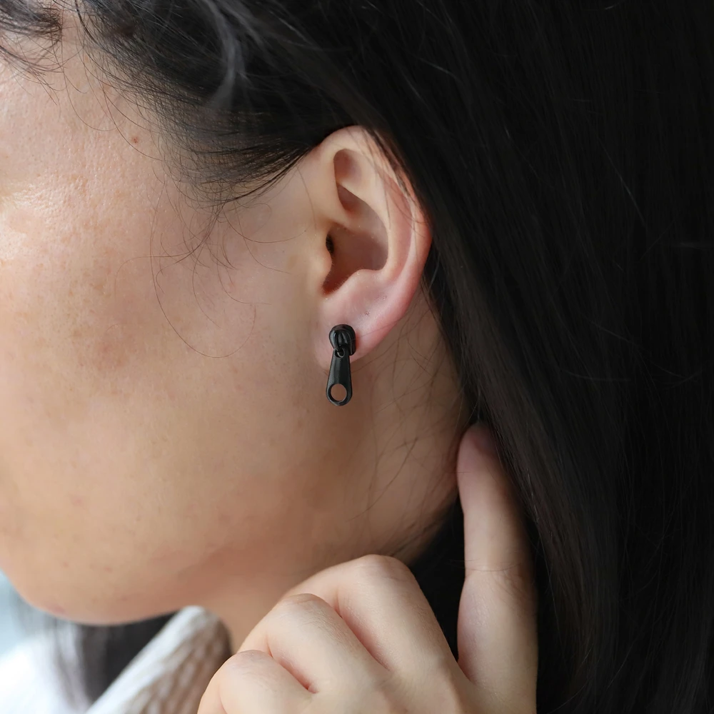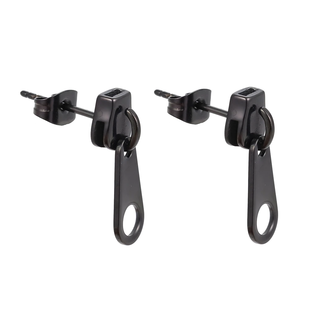 Visací náušnice z chirurgické oceli napodobující jezdce na zipu. Povrch náušnic je upravený černou barvou PVD. Délka náušnice 17mm, šířka 6mm. Náušnicové zapínání je na puzetky.