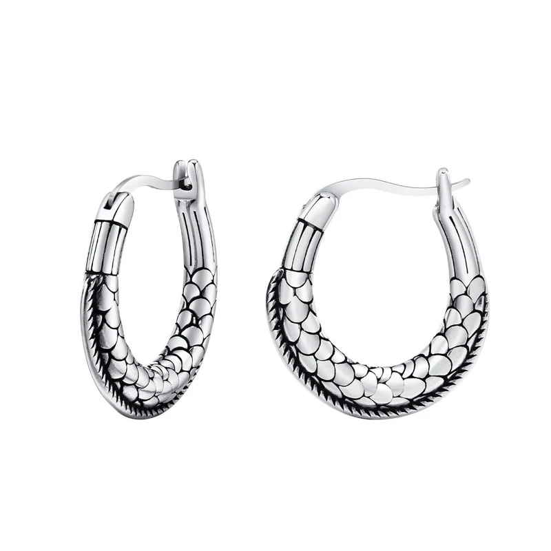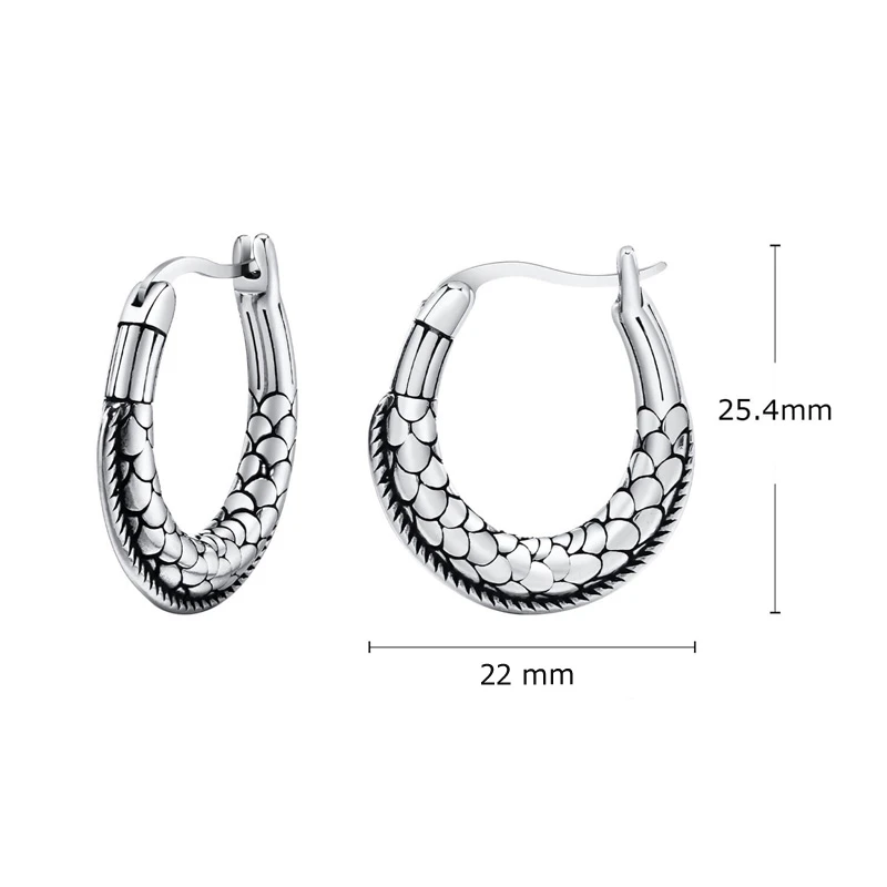 Visací náušnice z chirurgické oceli. Náušnice mají povrch ozdobený plastikou hadí kůže. Náušnicové zapínání je na francouzský zámek. Rozměry náušnic 25x22mm najdete zobrazené na podpůrné fotografii.