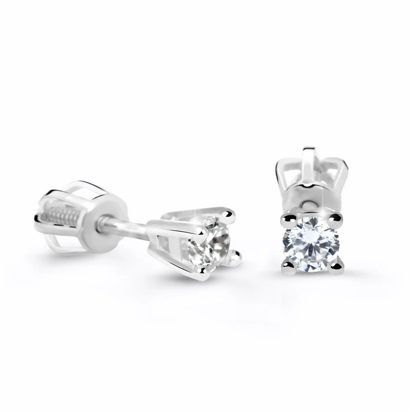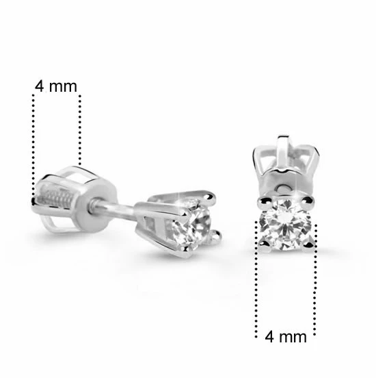 Diamantové náušnice pecky z bílého zlata 585/1000 na šroubek osazené pravými certifikovanými diamanty. Rozměry náušnic najdete vyobrazené na podpůrné fotografii. Diamanty zasazené v náušnicích mají hmotnost 0,200 ct. Kvalita diamantů SI1, barva G je hodnocena na základě tvz, 4C tříd: