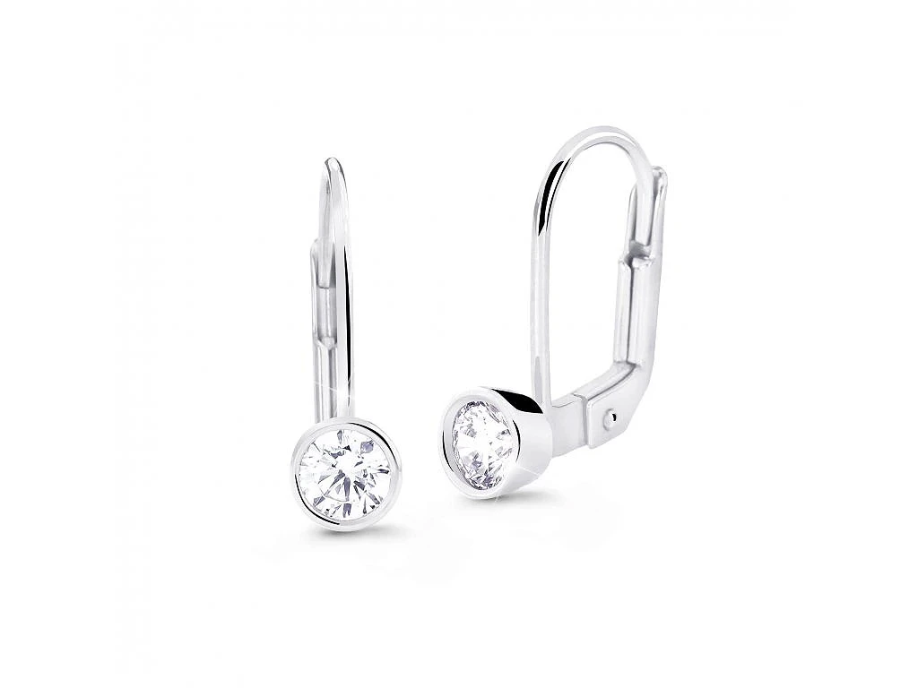 Zlaté visací náušnice vyrobené z bílého 14.ti karátového zlata. Náušnice jsou ozdobené prvotřídními zirkony. Náušnicové zapínání je na klapku. Ozdoba se zirkonem má průměr 4mm, "výška" náušnic 15mm.