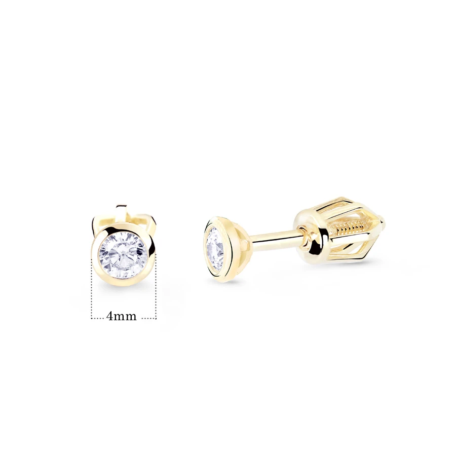 Náušnice ze žlutého zlata ryzosti 585/000. Jednoduché zlaté pecky se zirkony se zapínáním na šroubek. Průměr ozdoby se zirkonem 4mm.