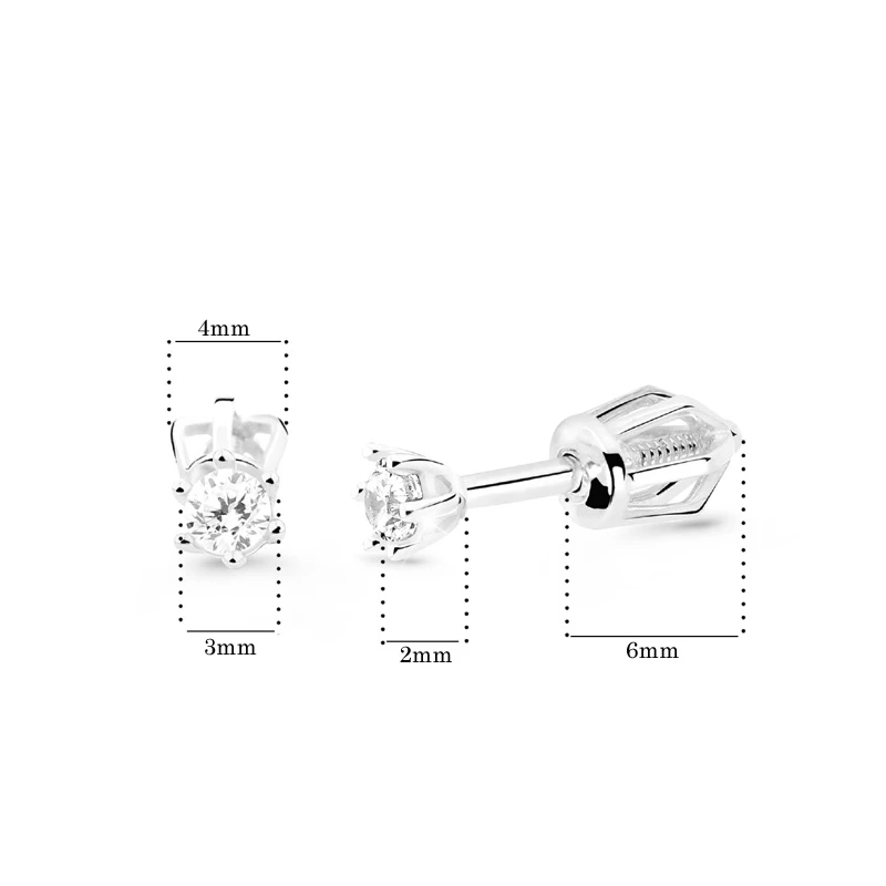 Zlaté náušnice na šroubek se zirkony vyrobené z bílého zlata ryzosti 585/1000. Klasické náušnice pecky ozdobené 3mm zirkonem. Praktické náušnicové zapínání na šroubek zaručuje pohodlné užívání náušnic. Rozměry náušnic najdete zobrazené na podpůrné fotografii.