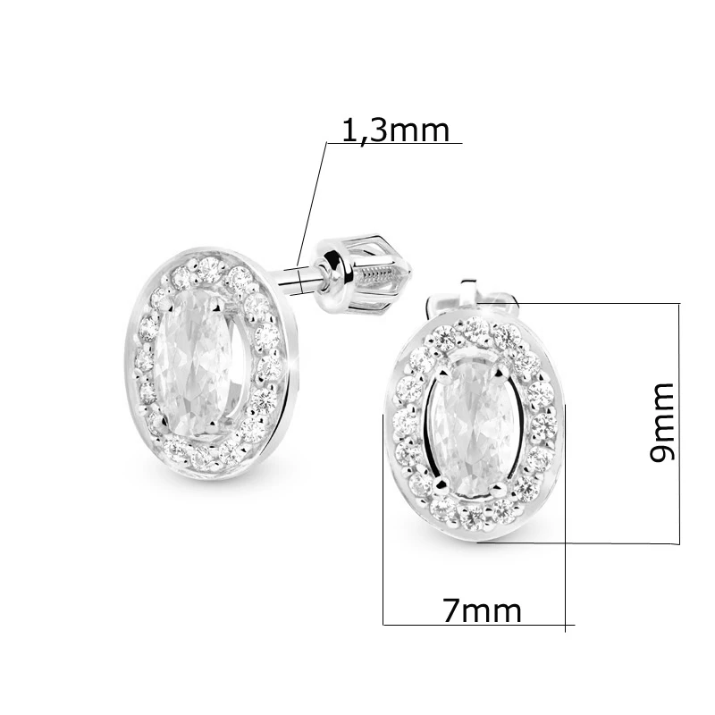 Zlaté náušnice se zirkony oválného tvaru. Náušnice jsou vyrobeny z bílého zlata 585/1000 a osazené prvotřídními zirkony. Tyto použité materiály vám zaručí nadčasovou eleganci a zářivý vzhled náušnic po mnoho let. Náušnicové zapínání je na šroubek. Výška náušnic 9mm, šířka 7mm.