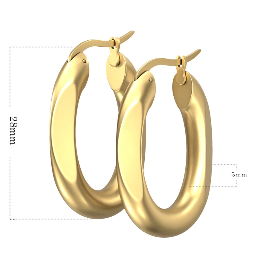Ocelové oválné náušnice pro ženy. Jako všechny ocelové šperky jsou také tyto náušnice z chirurgické oceli odolné proti poškození, nevyvolávají alergické reakce, neoxidují a jsou barevně stálé.